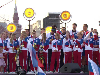 Новости. Общество Вести в 20:00. Более 30 килограмм драгметаллов: российских олимпийцев чествуют в Москве